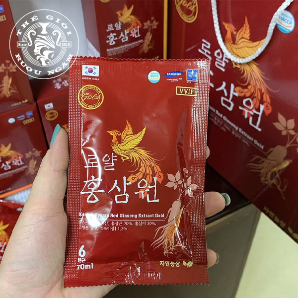 Nước hồng sâm Hàn Quốc 6 năm tuổi Hoàng Gia phiên bản Gold là thức uống được nhiều người yêu thích và sử dụng trong cuộc sống hiện đại ngày nay, vì không chỉ thơm ngon, bổ dưỡng mà còn rất tiện dụng. Với mẫu mã đẹp và sang trọng, nước hồng sâm sang trọng còn là món quà ý nghĩa dành tặng ông bà, cha mẹ, sếp và bạn bè.